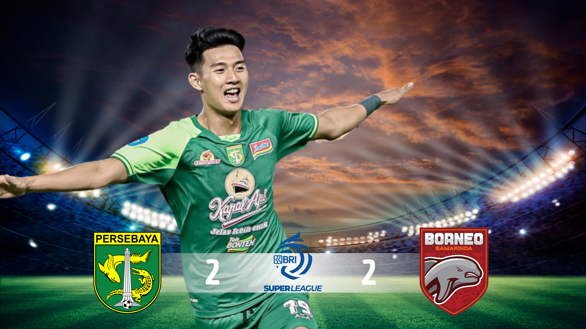 Namun untungnya tidak lama berselang tim Persebaya Surabaya berhasil menyamakan kedudukan melalui soloran galih freitas yang berhasil memanfaatkan kesalahan penguasaan bola pemain belakang Borneo FC.